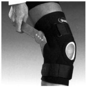 - Two polycentric hinges offer lateral and medical stability yet facilitate support through range of motion and thick felt donut buttress can be cut to provide patella stabilization