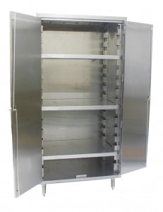 - Features 18 gauge type 430 stainless steel cabinet body, shelves adjustable on 4" vertical centers, double pan 20 gauge stainless steel hinged doors, and transverse rod handles featuring keyed locks