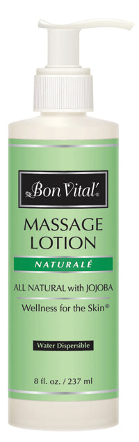 Bon Vital natural massage lotion contains all-natural ingredients with a jojoba oil base enriched with sea algae and green tea botanical extracts. Provides excellent absorption.