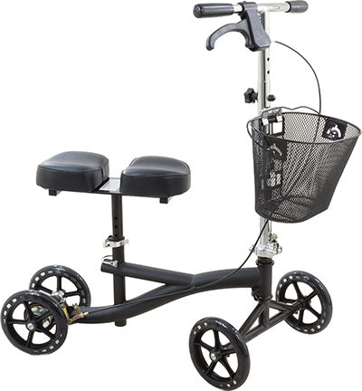 The Knee Scooter offers increased comfort and ease of mobility to patients who cannot put weight on their foot or ankle, but want to remain active. With its four large wheels and padded knee platform, the Knee Scooter is perfect for indoor and outdoor use. The offset post on the aluminum knee platform allows for right-to-left adjustment in seconds - no tools required. The Knee Scooter is equipped with an easy folding mechanism that collapses using a thumb release lever and fits beneath the raised knee platform for ease of storage and transportation. Comes black in color.Specifications: