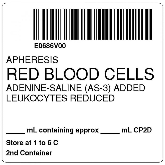 APHERESIS RED BLOOD CELLS ADENINE-SALINE (AS-3) ADDED LEUKOCYTES REDUCED __mL containing approx __mL CP2D Store at 1 to 6 C 2nd Container