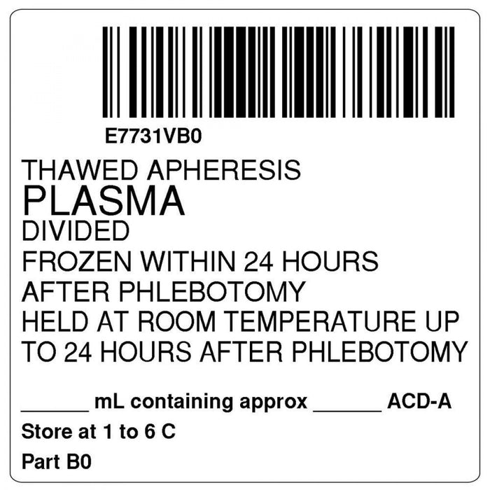 Isbt 128 Label (Synthetic, Permanent) "Thawed Apheresis Plasma"2" X 2" White, - 500 Per Roll