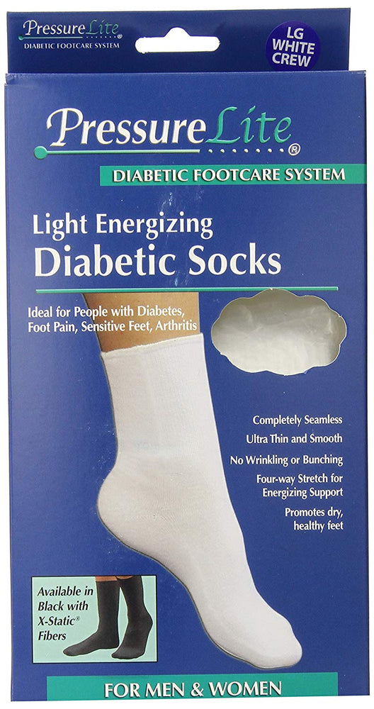 Spun from the toe and circling to the top, the PressureLite Energizing Crew Length Diabetic Socks from Activa are completely seamless so they fit close to the skin without wrinkling or bunching in the shoe. The four-way stretch of the material makes these socks smooth and soft. The anti-bacterial fibers wick moisture away to help prevent the growth of fungus and bacteria. Non-restrictive top keeps the socks from slipping down, no matter what size or shape leg. Perfect for people with Diabetes. Design based on research and fully tested. Color: White or Black. Size according to US shoe size.