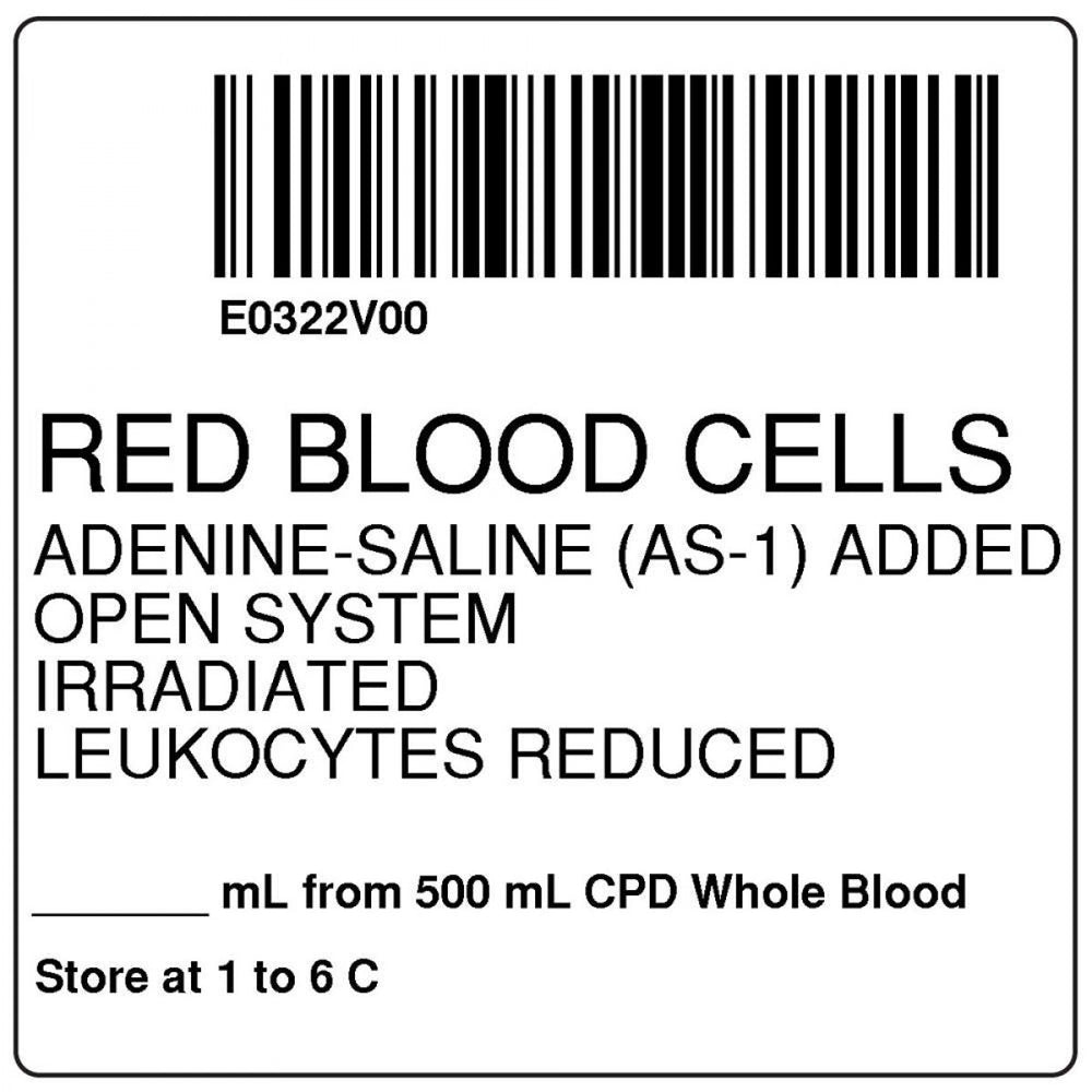 RED BLOOD CELLS ADENINE-SALINE (AS-1) ADDED IRRADIATED LEUKOCYTES REDUCED __mL from 500 mL CPD Whole Blood Store at 1 to 6 C ISBT BARCODE: E0322V00 PRIMARY BLOOD LABEL: CAN BE APPLIED DIRECTLY TO BLOOD BAG OR TO BLOOD BAG BASE LABEL