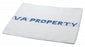 Product Information: Bath Towel, White with Blue Text, "VA Property Not For Sale", 100% Cotton, 20" x 40", 5.5 lb./doz.