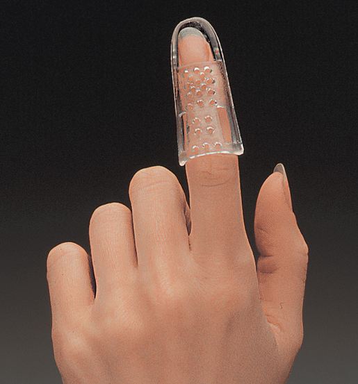 Clear, hard plastic allows view of the injured fingertip and nail bed. Optional VELCRO brand strap secures splint on the finger.Protects the distal phalanx and extends the DIP joint.
