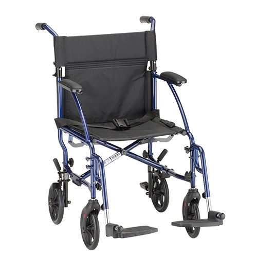 The Lightweight Transport Chair 18″ (377B-R) has a lightweight aluminum frame and padded armrests. It is foldable with removable wheels and has a quick release fold-down back.