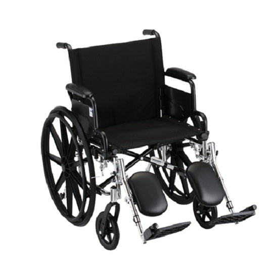 The Lightweight Wheelchair 20 in. comes equipped with flip back desk arms, as well as elevating leg rests. It also has dual axle positions for quick seat height conversion and flame retardant black nylon upholstery.