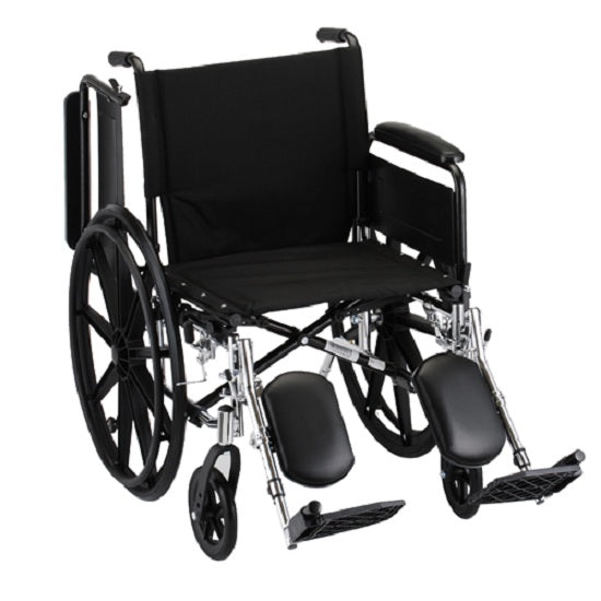 The Lightweight Wheelchair 20 in. comes equipped with flip back full arms, as well as elevating leg rests. It also has dual axle positions for quick seat height conversion and flame retardant black nylon upholstery.