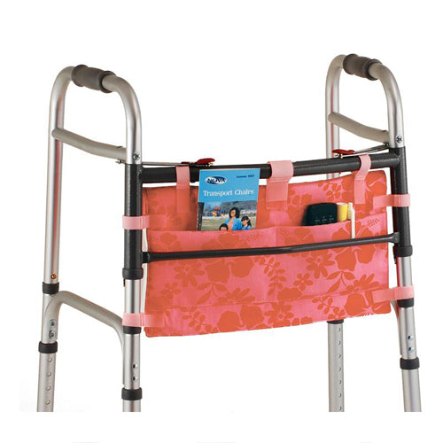 The folding walker bag (Aloha Pink) attaches securely to the 4080 and 4090 series folding walkers. It attaches to the front of the walker and has two roomy pockets for storage. Many items can fit inside such as reading glasses, a book, and a remote control. The bag comes in fun colors that will brighten up your walker.