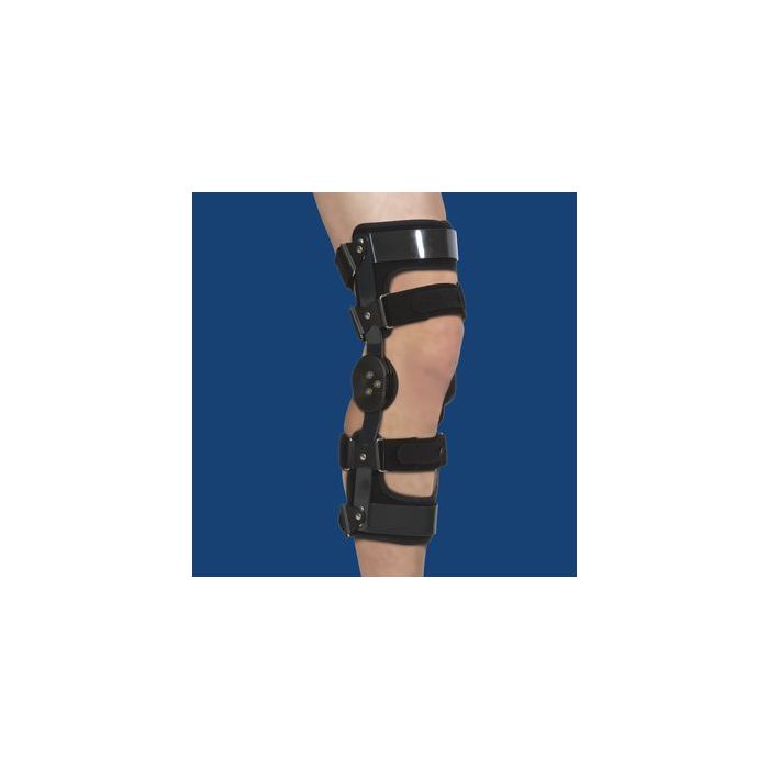 Brace is designed for the patient who wishes to continue activities after injury, post-surgery or for arthritic conditions. Brace has a soft molded pad and secure contact brace providing joint line contact for exceptional medial and lateral stability. No tools are required to easily change flexion/extension stop adjustments, to add extra protection in controlling ROM as patients increase their range of activities.